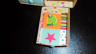 Let’s get started with the ideas - For today's project I made a 4 drawer matchbox dresser. It is made of 4 matchboxes I made from kinda following this guideline. All the paper is scrap paper and I couldn't tell you the names. sorry. I used 4 baby blue brads for the drawer knobs. You could use a button or beads here also. The large flowers and butterfly on lid came from K&Company.